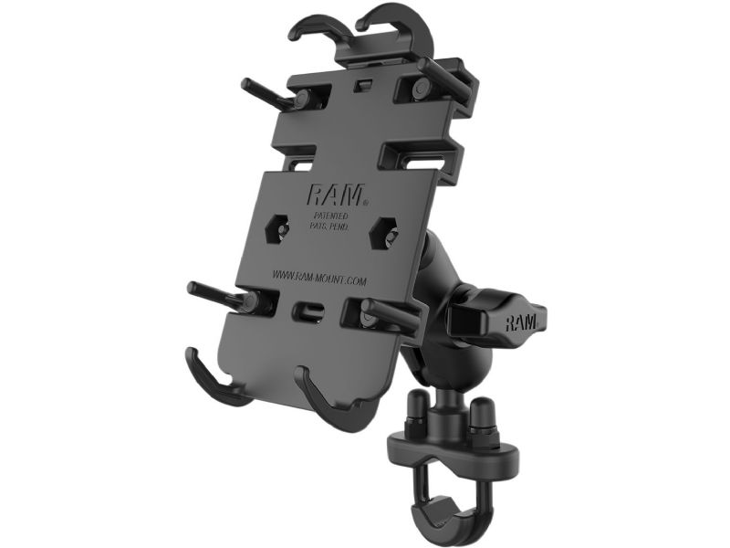 The RAM Quick-Grip-„¢ Handlebar Mount consists of a zinc coated u-bolt base, double socket arm and spring loaded cradle for supporting most phones