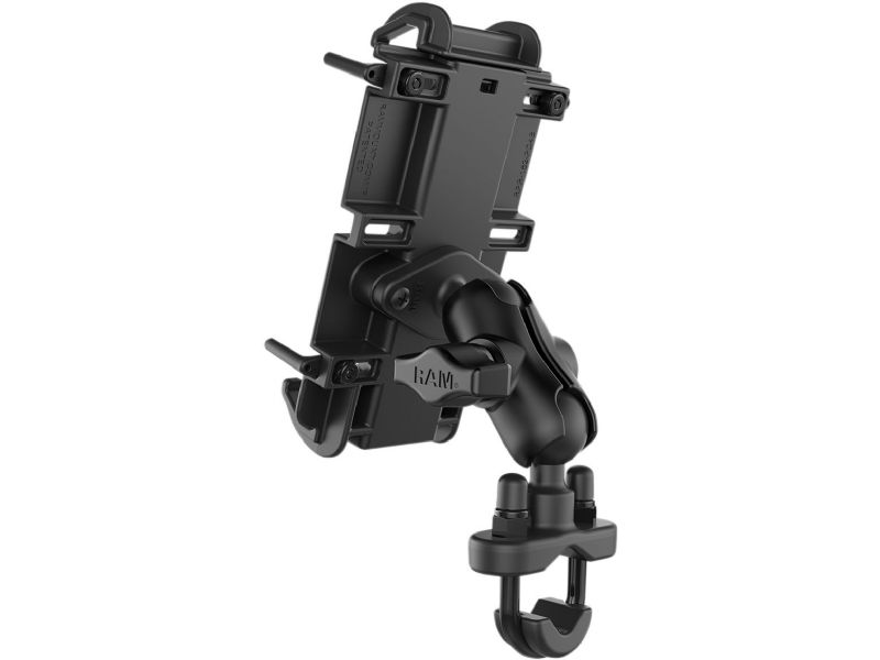 The RAM Quick-Grip-„¢ Handlebar Mount consists of a zinc coated u-bolt base, double socket arm and spring loaded cradle for supporting most phones