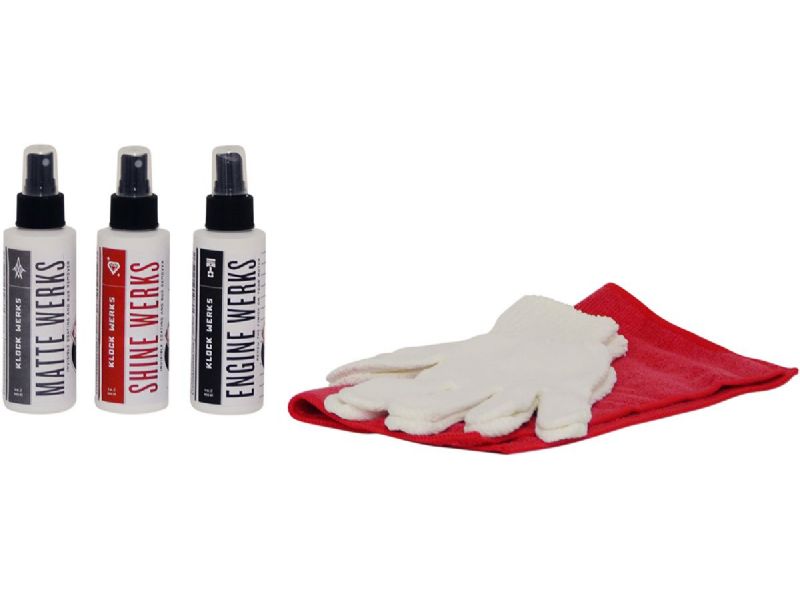 One 4 oz. bottle each of Shine Werks, Matte Werks, and Engine Werks along with Detail Werks microfiber polishing gloves, and a red microfiber towel all included in the Klean Werks Kit