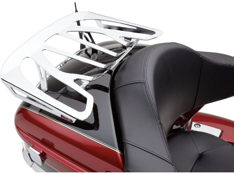 Designed to mount to the trunk, the rack is formed from solid steel with laser cutoutsThe rear edge has a small up-lift to position light loadsPolished and chromedSimple to install (comes with everything you need to mount it)Made in the USA