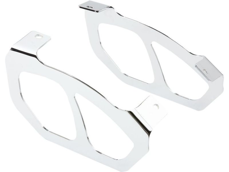 Unsecured saddlebags can end up in the rear wheel if you don't take precautions. Consider Cobra's Bag Supports chrome-steel protection for spoked-chewed luggage. These supports attach to existing hard mounts on the bike for quick installation. Made of thick steel tubing bent to fit each bike model and then polished and chrome plated. Protect your investment that you have made in your saddlebags with Cobra's Saddlebag Supports.
