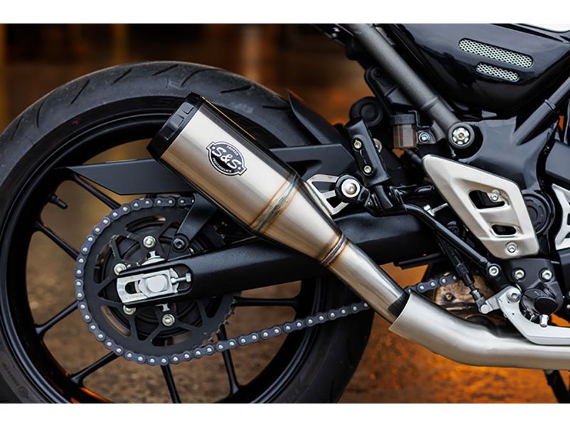 - Brushed stainless steel muffler body with exposed TIG welds
