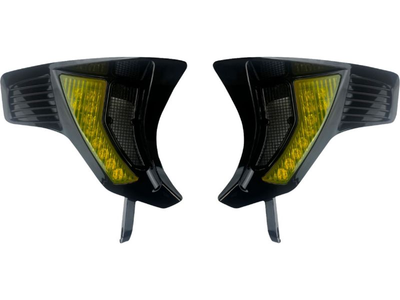 Integrated LED front turn signals with gloss black assembly enhanced with stylish fins that add a trendy, race inspired aesthetic. Decorative mesh enables factory air flow