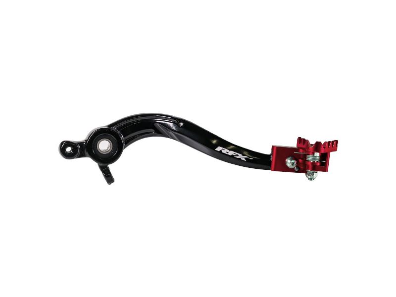 The RFX Pro Series ST Rear Brake Levers are engineered and tested to meet the demands of top-level riders.Crafted from durable 7075-T6 aluminum, these brake levers feature an OEM-style forged shaft with a smooth finish to minimize wear often associated with ridged designs. The CNC-machined flexible tip, made from billet aluminum, is spring-loaded and rotatable. This innovative design helps reduce damage during impacts, such as in ruts, by allowing the tip to spin. The tip also includes steel teeth for enhanced grip in muddy conditions and a built-in stop that limits rotation to 90 degrees, protecting the lever from further damage. For added protection, the brake levers come equipped with a cable brake snake, which helps prevent the shaft from bending in a collision.