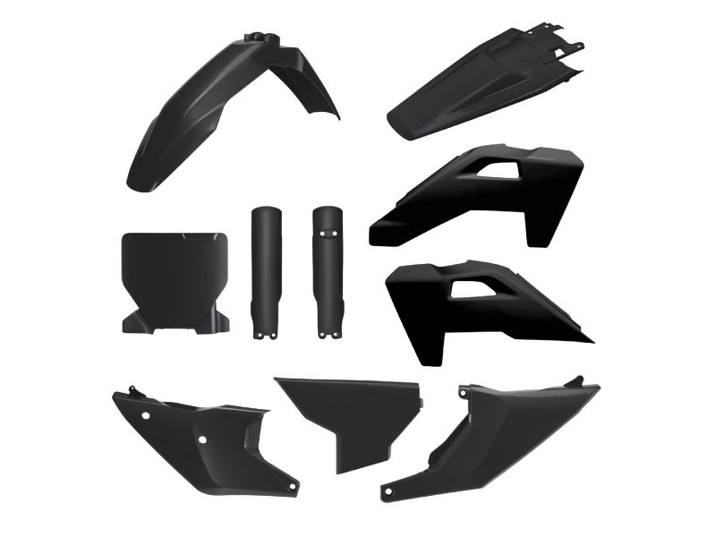Kits include front and rear fenders, side panels, radiator shrouds, and # plate in factory OEM colors