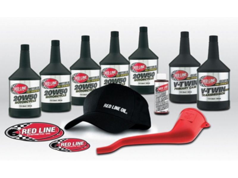 Kit includes: 5 quarts of Motorcycle Oil, 1 quart of V-Twin Transmission Oil with ShockProof, 1 quart of Primary Chain Case Oil, 1 bottle of Fuel Injection Cleaner for Motorcycles, a sticker kit, a Red Line Oil embroidered hat, and a versatile funnel