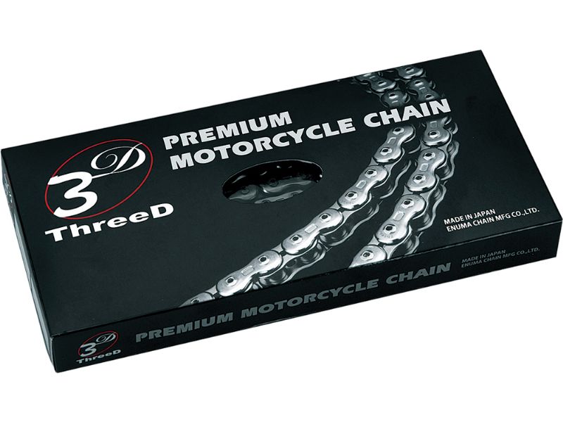 EK ThreeD (3D) Premium motorcycle chain is Elegant, Strong, Detailed and Magnificent. It offers the ultimate shape with flexibility and strength. EK Chain set out to produce a premium chain that was as beautiful as it is strong. An impressive outer plate shape that offers a curved form to reduce weight and increase appeal is connected together with inner plates and pins that feature lightening holes to further reduce mass. QX2 X-Rings have a better wear-resistance and performance than standard QX-Rings by 30% resulting in a chain that puts 1% more power to the rear tire.