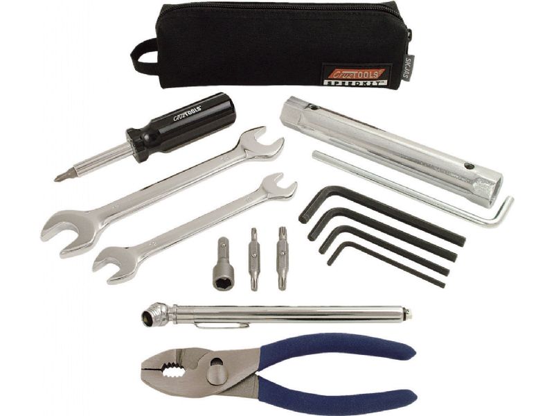 - Includes wrenches to cover most common metric fasteners, 4-in-1 screw driver, nut driver, torx bits, hex keys, pliers, 2-in-1 spark plug socket and tire gauge in a durable zipper pouch.