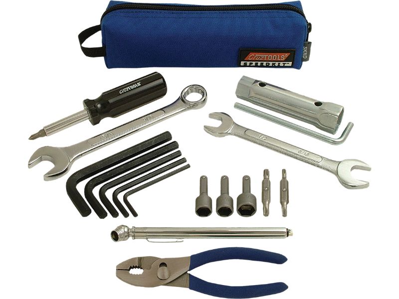- Includes wrenches to cover most common metric fasteners, 4-in-1 screw driver, nut driver, torx bits, hex keys, pliers, 2-in-1 spark plug socket and tire gauge in a durable zipper pouch.