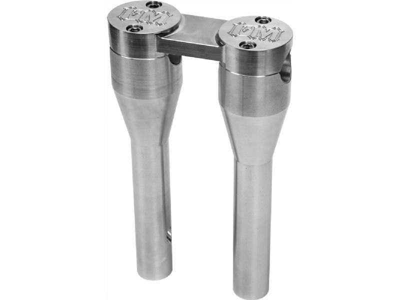Forbidden Motorcycles risers feature a 1-1/8" clamping area for MX style bars. They come in 9" and 11" heights and raw or black anodized finishes. The top clamp is a one piece construction for extreme stability and durability. The FM logo is machined into the T 6061 aluminum. The risers are pre-drilled for internal wiring for a super clean assembly, we also offer FM moto bars by Fly Racing with 1" ends for HD controls and pre-drilled holes for internal wiring to bolt directly onto these risers!