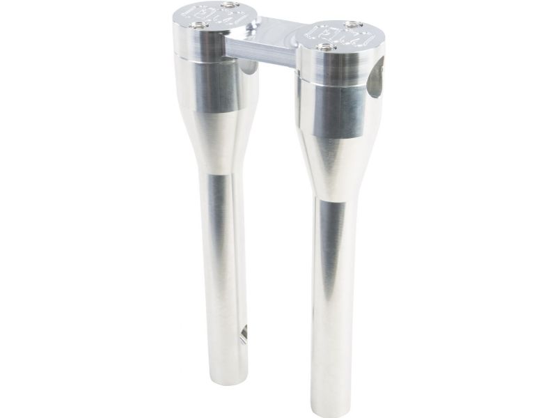 Forbidden Motorcycles risers feature a 1-1/8" clamping area for MX style bars. They come in 9" and 11" heights and raw or black anodized finishes. The top clamp is a one piece construction for extreme stability and durability. The FM logo is machined into the T 6061 aluminum. The risers are pre-drilled for internal wiring for a super clean assembly, we also offer FM moto bars by Fly Racing with 1" ends for HD controls and pre-drilled holes for internal wiring to bolt directly onto these risers!