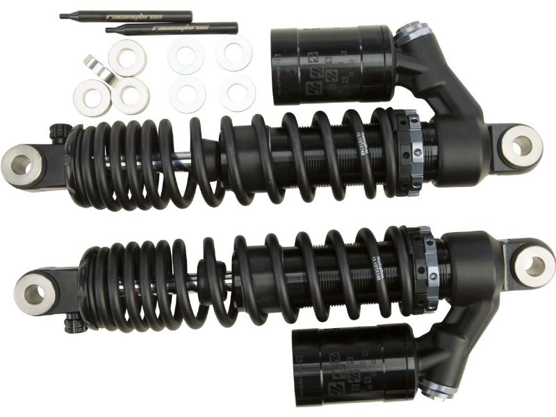 HardDrive remote reservoir rear shocks by RacingBros feature full adjustability with preload, compression and rebound adjusters to easily adapt to all riding styles and conditions. Whether you choose stock 12.5 length for your Dyna or Sportster, or you want the tall 14 curb hopper club style look, these performance shocks with race proven Speed Adaptive Valving will provide you with the ultimate ride.