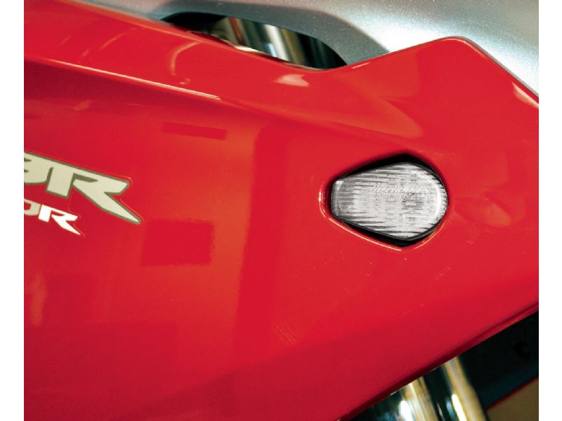 Hotbodies Racing’s sleek, Flush-Mount LED Blinkers are designed for an aerodynamic edge. These unique, Industry First custom-designed blinkers fit neatly into the fairing pockets of the factory blinker stalks, giving your bike a clean, slippery look of speed. Because our Flush-Mount Blinkers are shaped for each model bike, their integrated finish accentuate the streamlined designs. Our Flush-Mount Blinkers feature amber LED Lights behind clear, smoke, blue, or red lenses for an exacting edge-less fit.