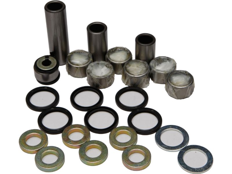 Contains all of the bearings (including the lower shock bearing kit), shafts, seals and bushings required to rebuild swing arm linkage to factory specifications
