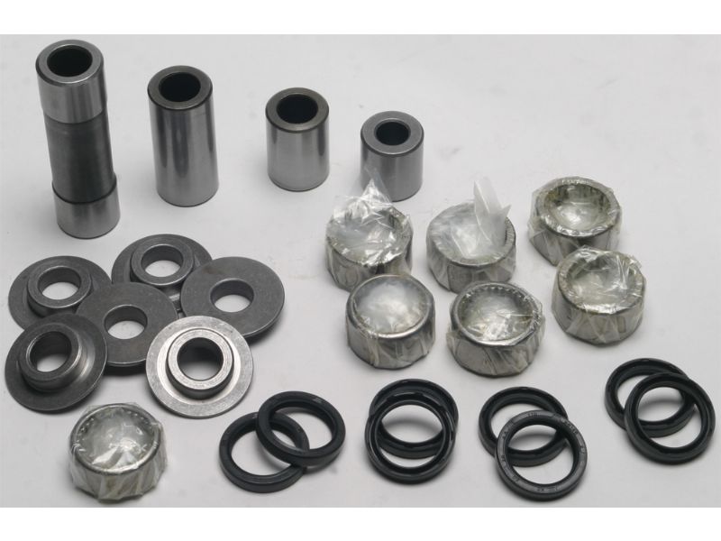 Contains all of the bearings (including the lower shock bearing kit), shafts, seals and bushings required to rebuild swing arm linkage to factory specifications