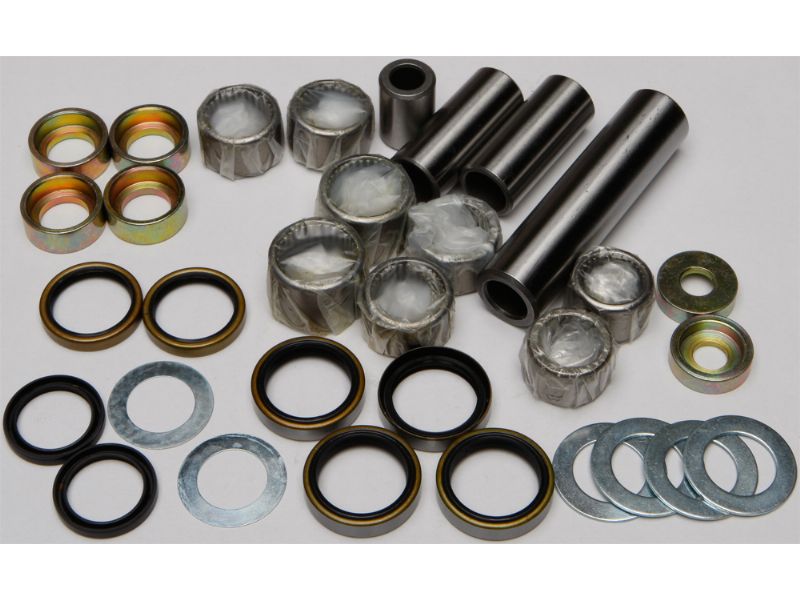 Contains all of the bearings (including the lower shock bearing kit), shafts, seals and bushings required to rebuild swing arm linkage to factory specifications