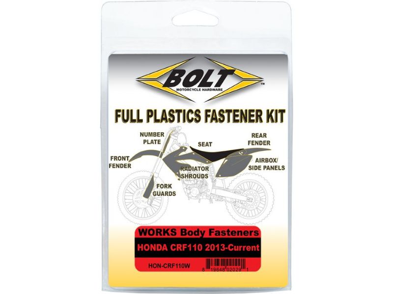 Body Work Fastener Kits contain all the OEM match fasteners and bushings to install your plastics including front and rear fenders, fork guards, radiator shrouds, side covers, and number plates
