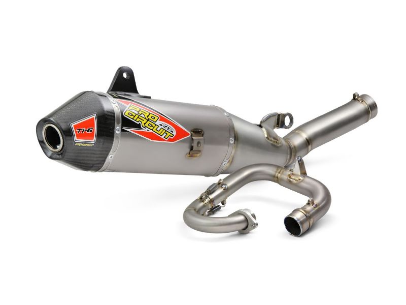The Ti-6 Titanium Exhaust System is designed to improve performance and power over previous designs. Constructed of titanium throughout the head pipe, mid pipe and canister, this is the ideal exhaust for any off-road or closed course racer looking for improved performance, durability and a professional look. The Ti-6 system comes with a removable United States Forest Service (USFS) Approved Spark Arrestor making it easy to alternate between off-road and closed course riding.