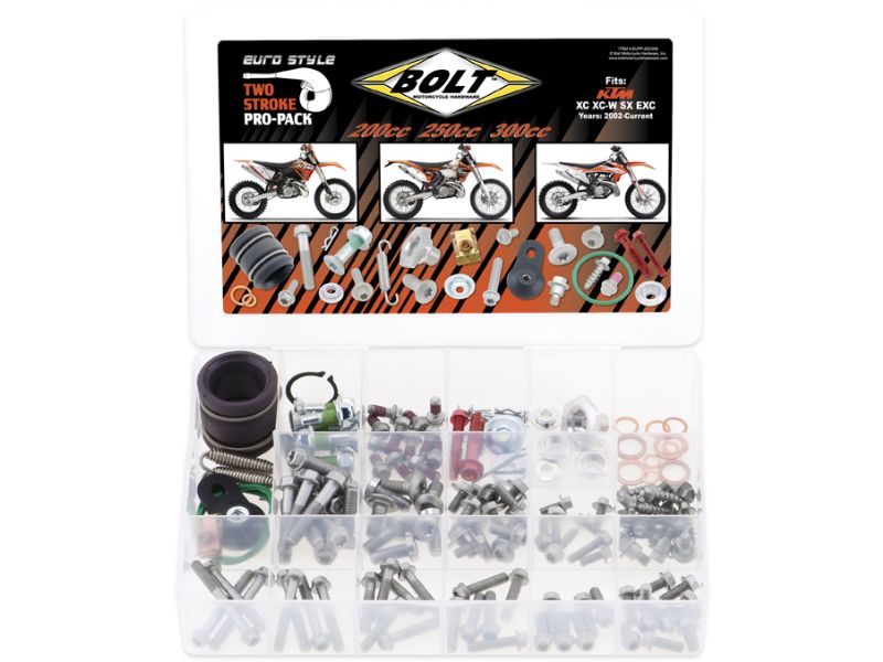 Two Stroke Pro Packs are similar in content to the Four Stroke Pro Packs but with the addition of pipe springs, rubber O-rings, silencer sleeve and additional hardware that applies specifically to two-stroke engines
