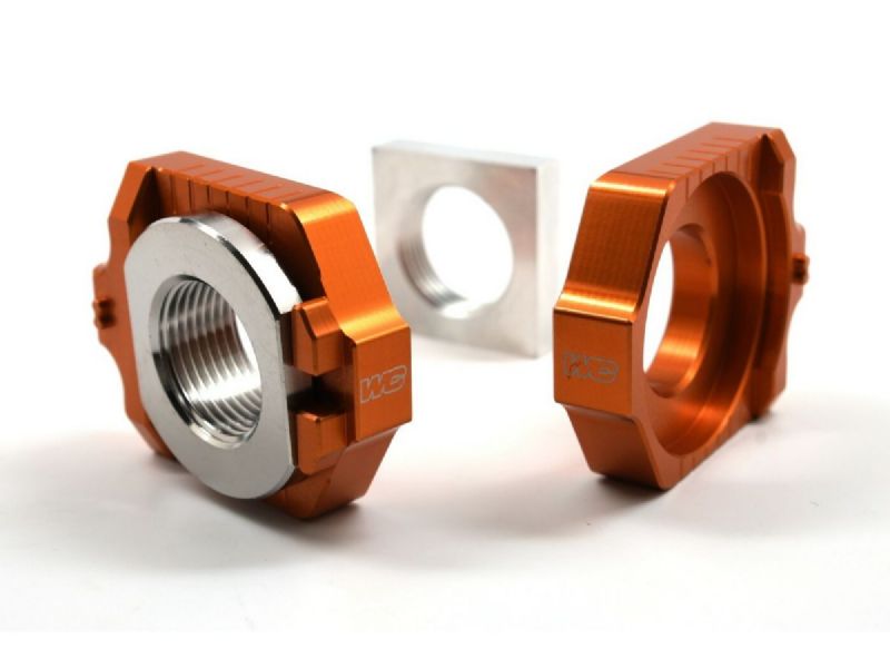 Consisting of a pair of CNC’d Elite axle blocks, a titanium drive-side receiver and a square removal tool nut, the Elite Axle Block Kit converts your stock Off-Road or Dual Sport model’s rear axle from a fixed design into a floating type. Factory teams use this same floating type design on their race team bikes to improve traction as well as straight line stability and now those same benefits are available from this kit. Another key component is the integrated receiver post on each axle block that allows the use of a caliper to precisely measure and match the left and right axle block’s position. This assures exact alignment of the chain and sprocket so critical to prolonging chain and sprocket life.