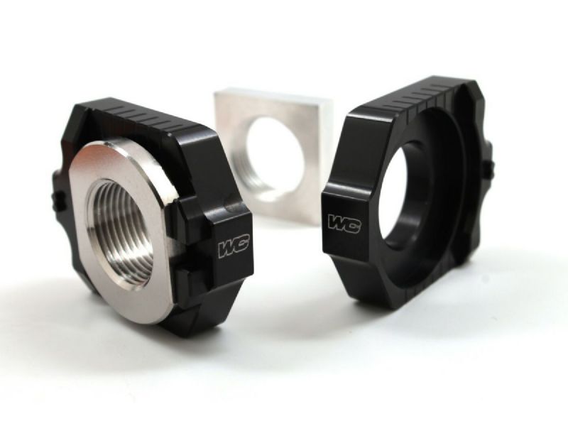 Consisting of a pair of CNC’d Elite axle blocks, a titanium drive-side receiver and a square removal tool nut, the Elite Axle Block Kit converts your stock Off-Road or Dual Sport model’s rear axle from a fixed design into a floating type. Factory teams use this same floating type design on their race team bikes to improve traction as well as straight line stability and now those same benefits are available from this kit. Another key component is the integrated receiver post on each axle block that allows the use of a caliper to precisely measure and match the left and right axle block’s position. This assures exact alignment of the chain and sprocket so critical to prolonging chain and sprocket life.