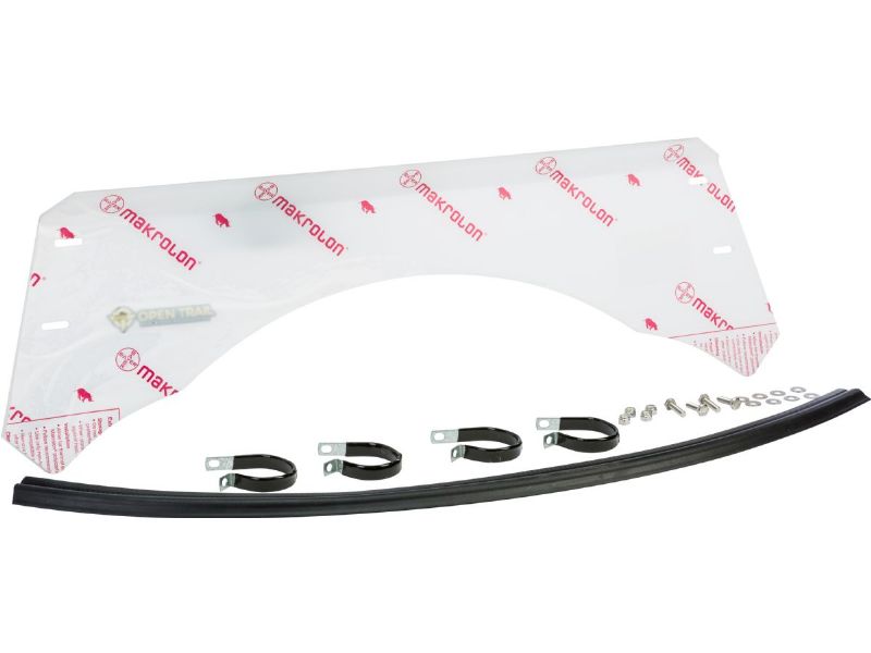 The Open Trail half windshield is made with ultra durable 0.177" Makrolon® Polycarbonate for long lasting, high strength protection and a clear view of the trail. This half windshield is 11" tall. The windshield has a seal at the bottom that rests against your vehicle. It is attached to your roll bars using four galvanized steel, rubber coated P clamps that are bolted to the windshield through pre-drilled holes.